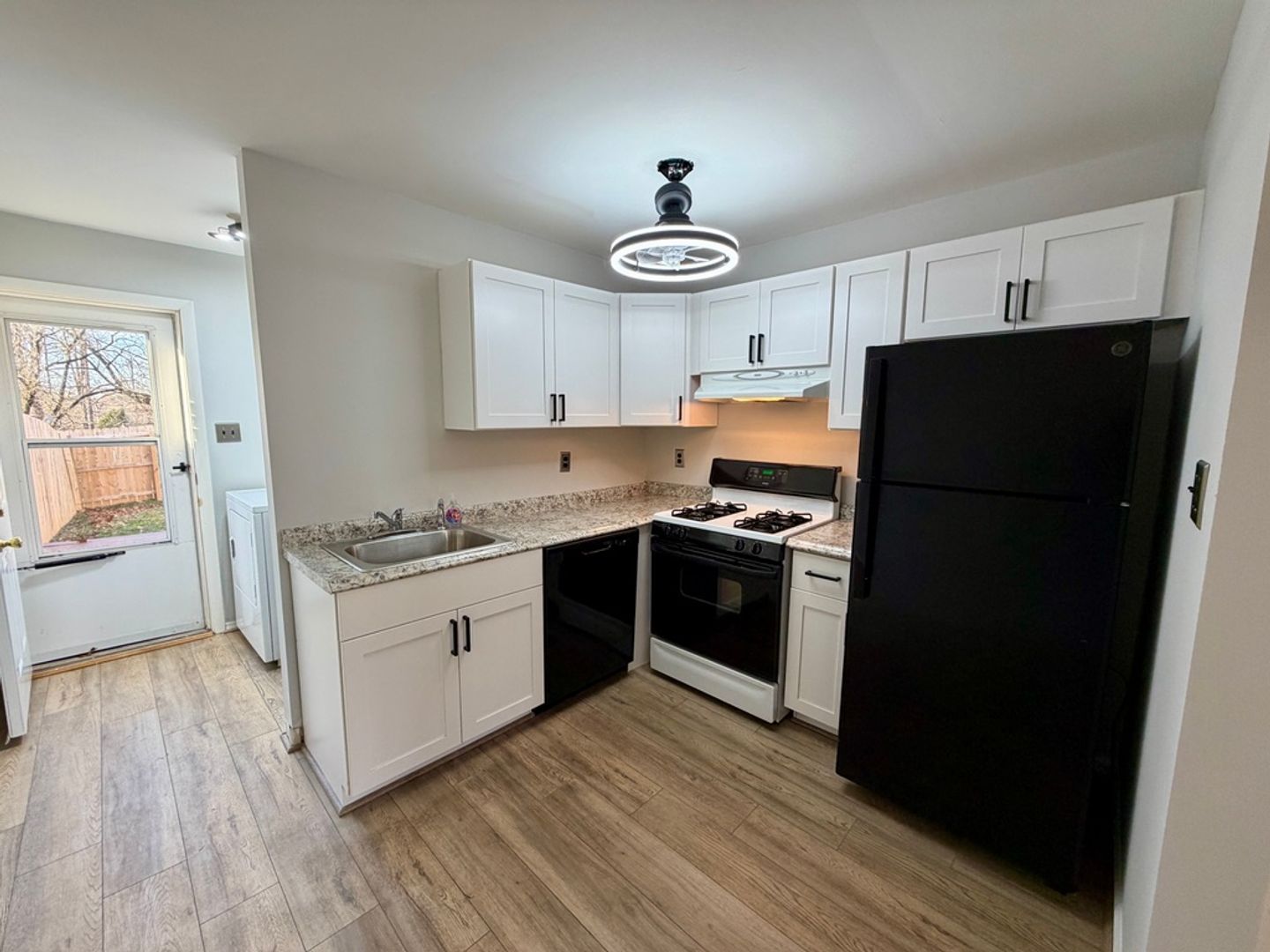 A comfortable and efficient two-bedroom layout, the home features central air conditioning and a fully renovated bathroom with a modern walk-in shower. A full appliance package is included, featuring a refrigerator, gas range, dishwasher, microwave, and full-size washer and dryer.